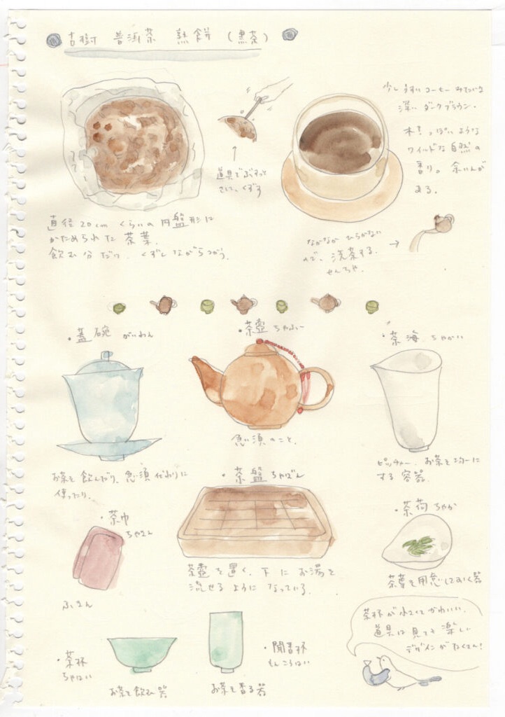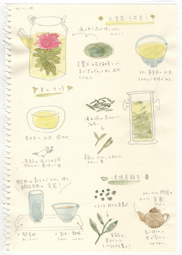 体験レッスンでは4種のお茶を淹れていただきました。どれもとっても美味しくて個性的!体験後にスケッチしたメモがこちらです。少しでも雰囲気が伝わると良いのですが…!スマホでご覧いただいている方にはちょっと小さい絵でしたね。拡大しながらご覧くださいね!次回から見やすく改善します!