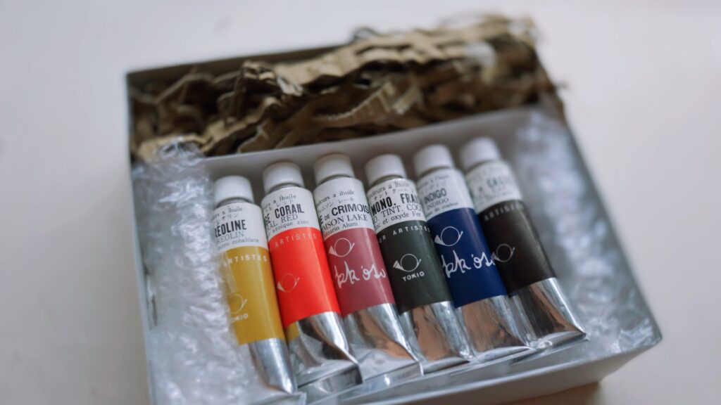 絵の具が動かないよう丸めたプチプチが添えてあったり、ダンボールの千切り(?)みたいな緩衝材が使われていたり、絵の具の保護だけでなく見た目にも美しく包まれていました。