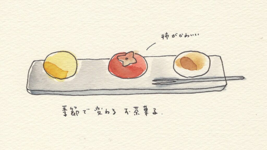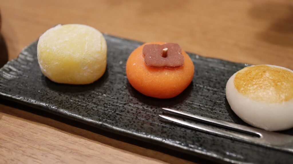 お茶にはお茶菓子がセットでついています。私がお邪魔した12月の上旬は、こんなお菓子でした。右からみたらし団子、柿の形のおもち、柚子のおもち。お茶の渋みともちもち系の甘いお菓子は良く合います。