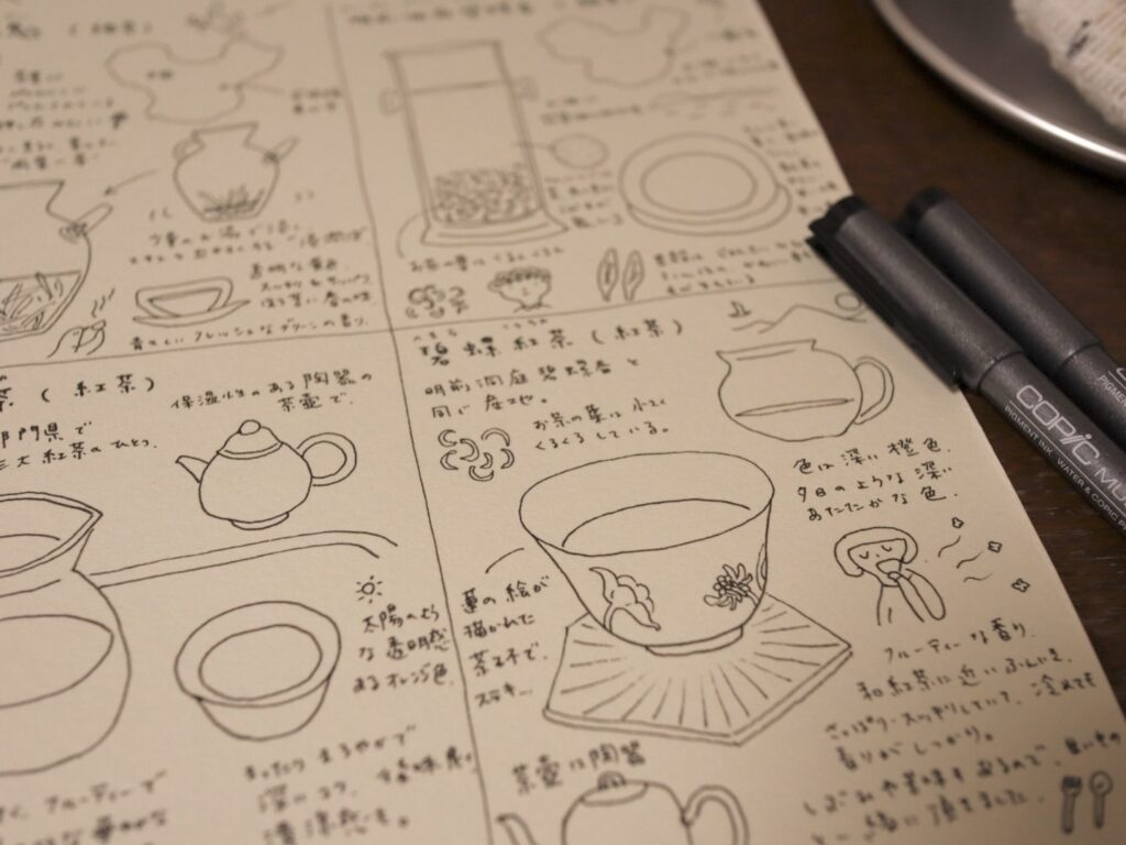 緑茶と紅茶をいただいてみて、お茶の色のきれいさに感動しました。緑茶は明るく輝く黄色、紅茶は今にも沈む太陽のような強く暖かな色。きれいだな〜、自然と人の手が作った色。