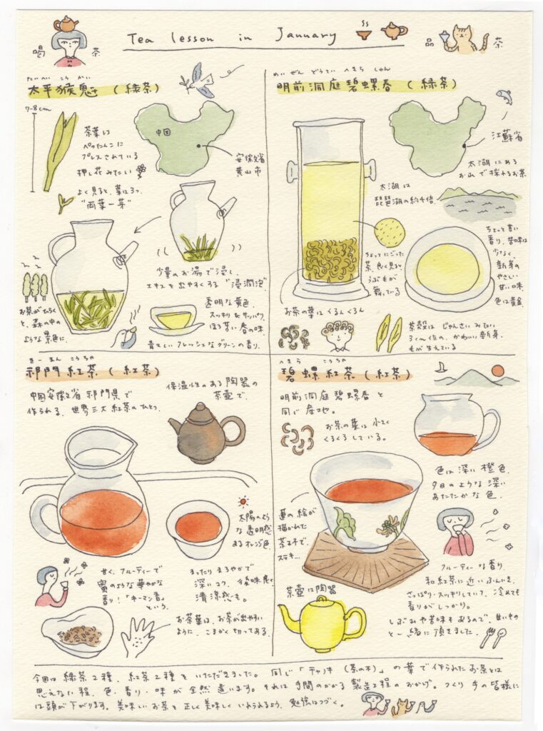 今月は緑茶2種と紅茶2種を味わいながら、緑茶と紅茶の製法の違いを学びました。